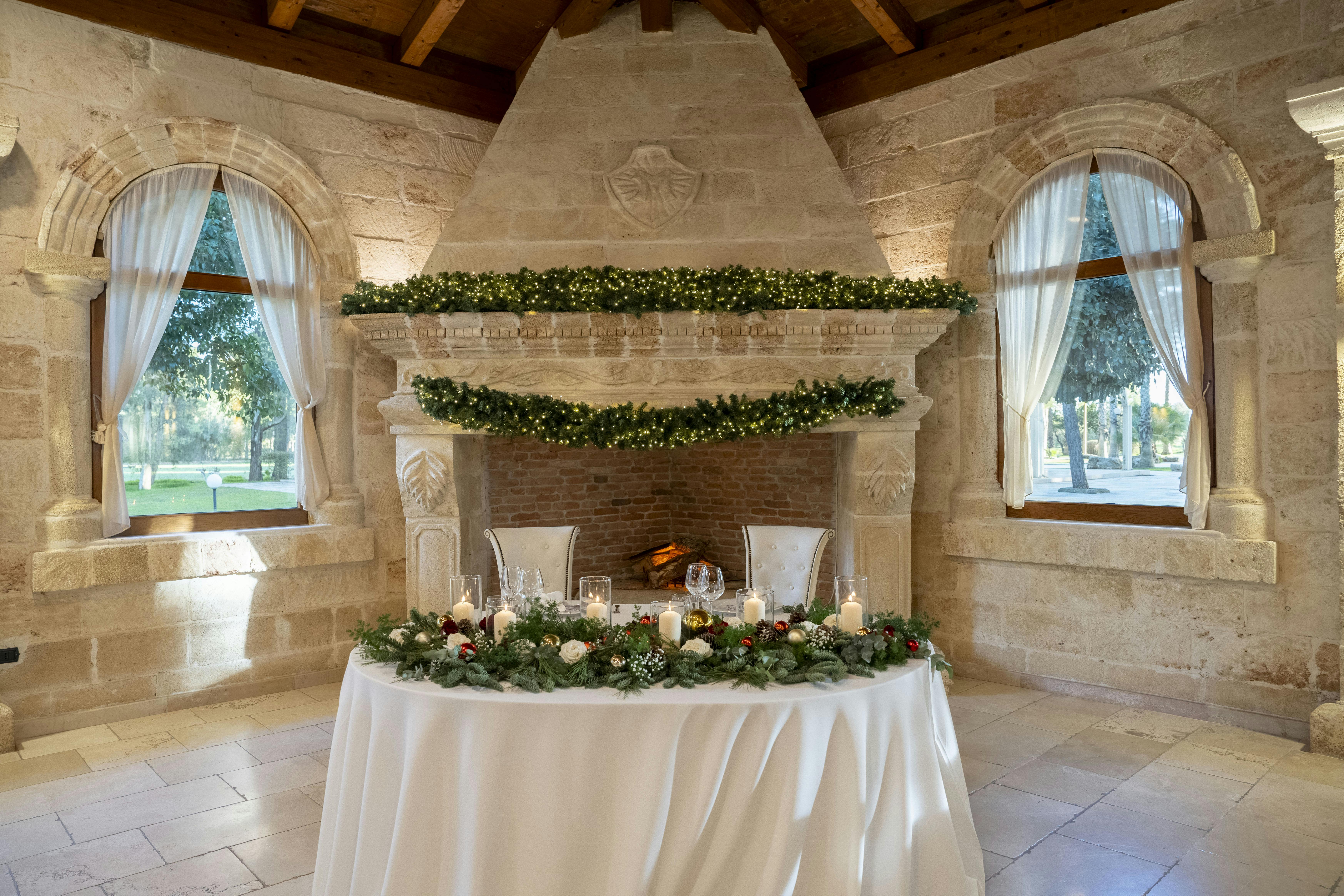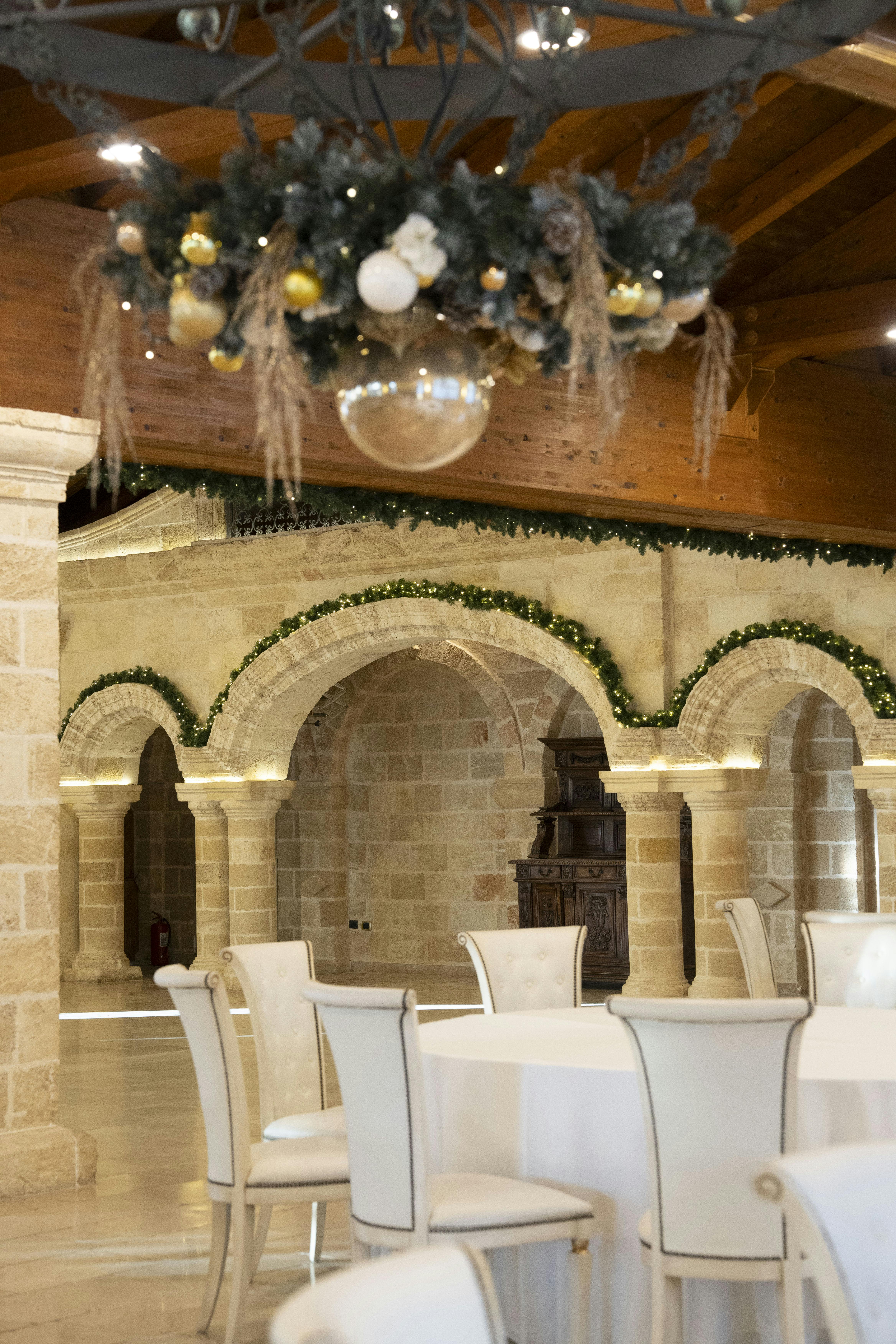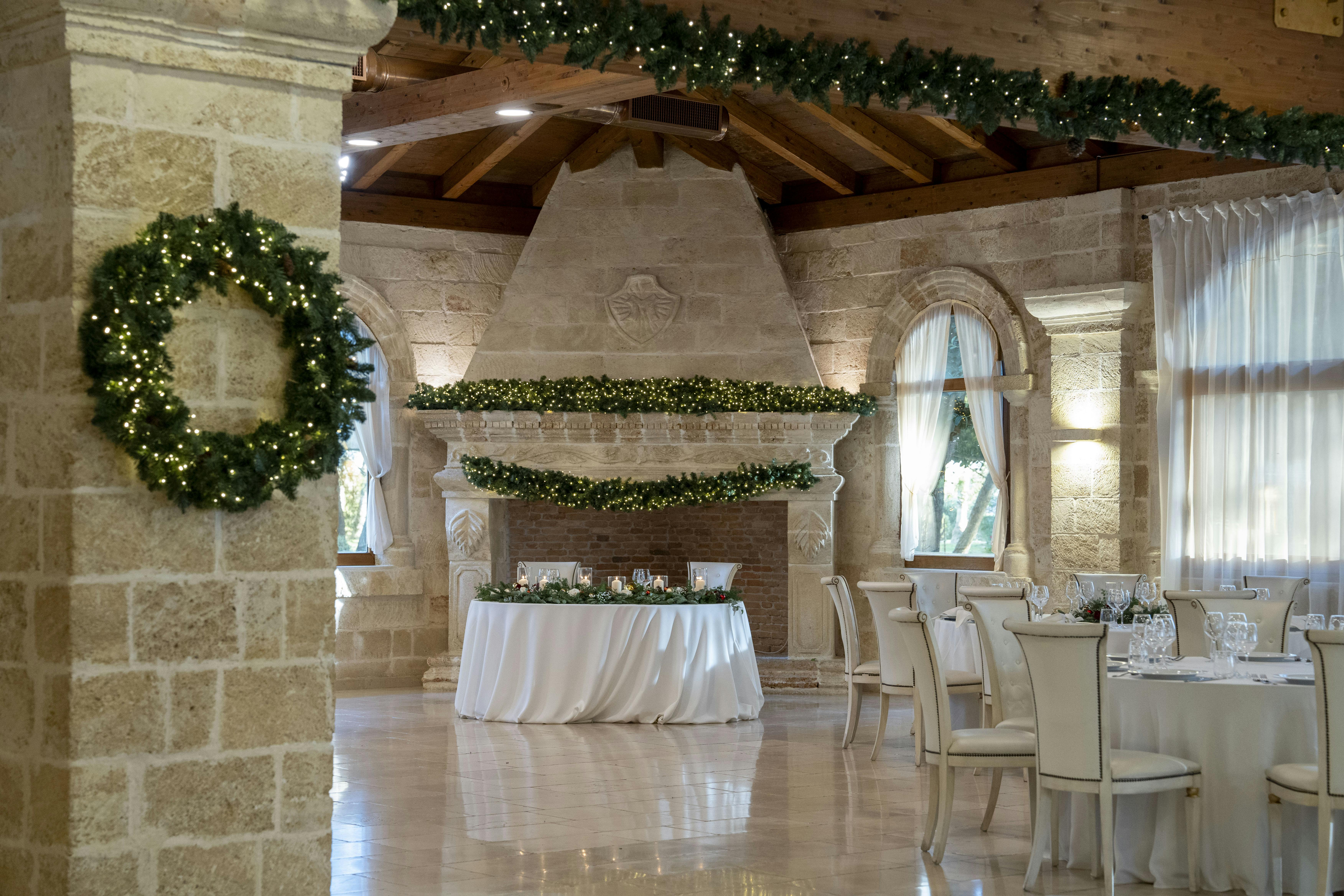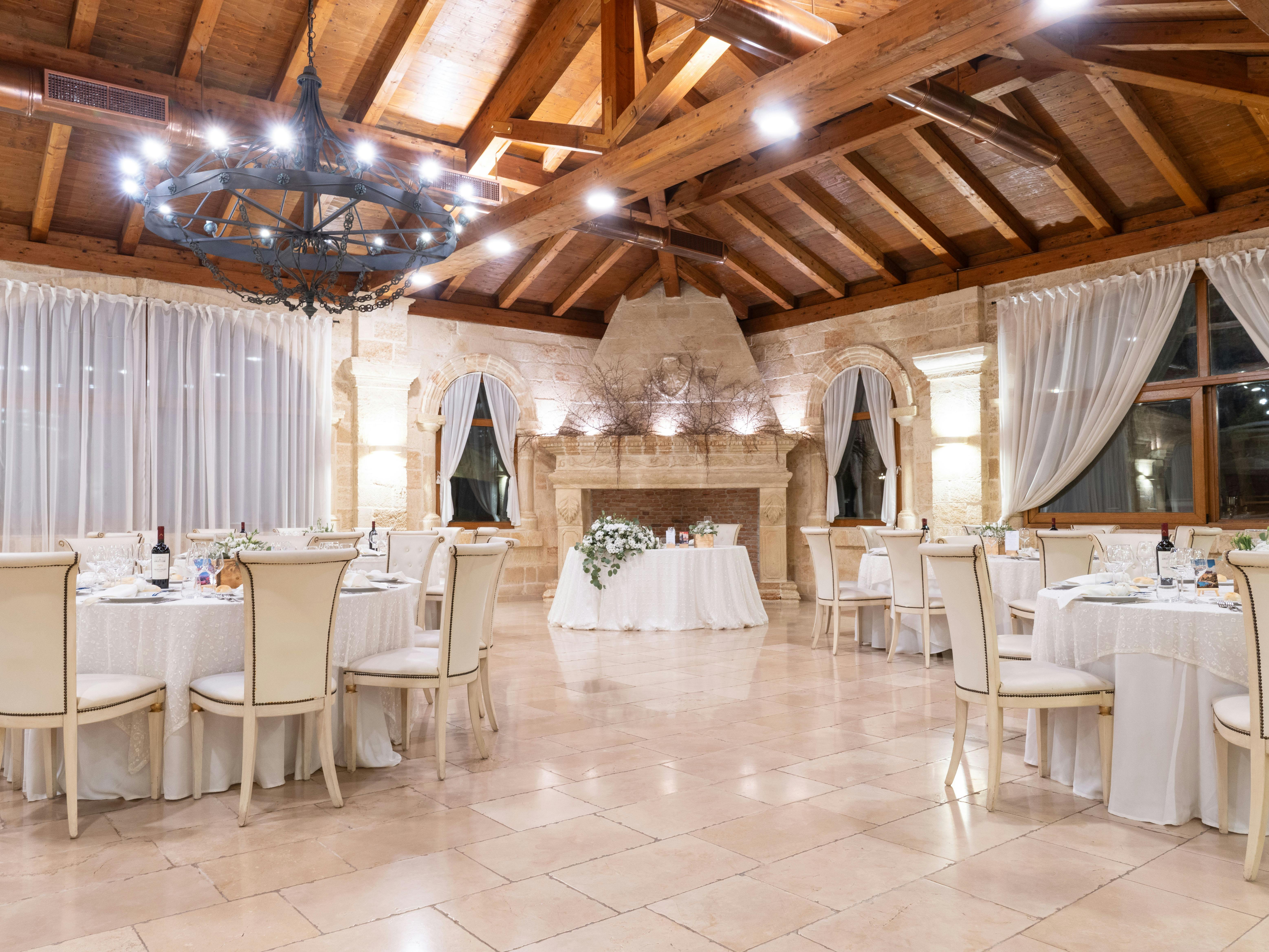 La Sala Imperiale, uno spazio di dimensioni maestose e di inconfondibile eleganza, capace di accogliere fino a 300 ospiti in un ambiente raffinato e coinvolgente, ideale per eventi di prestigio. Avvolta da pareti in carparo, una pietra locale dalle tonalità calde e uniche, questa sala trasuda la tradizione e l'autenticità pugliese, mentre storici lampadari in ferro battuto pendono maestosi dal soffitto, regalando luci soffuse e un'atmosfera dal fascino antico. Il tetto in legno infonde al locale un senso di intimità e calore, elevando l'esperienza estetica e facendo risaltare la bellezza naturale dell'ambiente. Il pavimento in chianche, la tipica pietra della tradizione pugliese, racconta una storia di tempi lontani, aggiungendo un ulteriore tocco di autenticità. Progettata per ospitare ricevimenti nuziali, sontuosi banchetti ed eventi di alto profilo, la Sala Imperiale si distingue per la capacità di adattarsi a qualsiasi esigenza di allestimento, consentendo una totale personalizzazione per dare vita a qualsiasi dettaglio desiderato. Questo spazio, che unisce eleganza senza tempo e funzionalità moderna, trasforma ogni evento in un'esperienza unica e irripetibile, dove ogni momento diventa un ricordo prezioso da conservare.